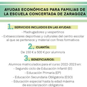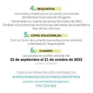 Nos hacemos eco de la convocatoria de Ayudas Económicas al Alumnado de Centros Escolares Concertados de Zaragoza promovida por el Ayuntamiento de Zaragoza para el curso 2022/2023, que se podrá solicitar desde el viernes 23 de septiembre hasta el día 21 de octubre 2022, a las 13h.