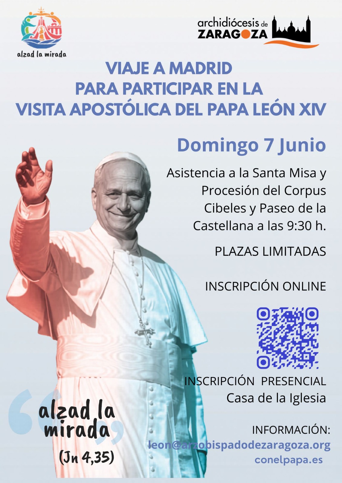 Desde la Archidiócesis de Zaragoza se organiza un viaje muy especial a Madrid para participar en la Santa Misa y la Procesión del Corpus Christi, presididas por el Papa León XIV el domingo 7 de junio a las 9:30h. en la Plaza de Cibeles.